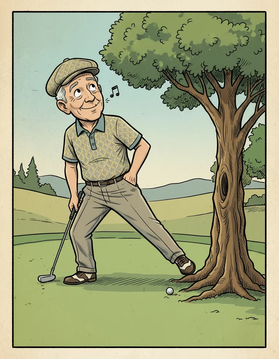 Instead of playing the ball from behind a tree, the golfer uses his shoe to nudge the ball into a clear opening while his opponent isn't looking.